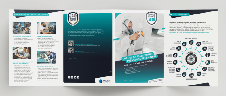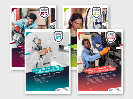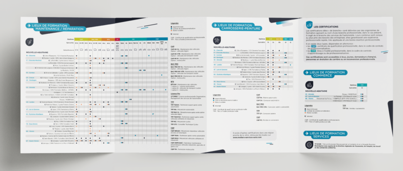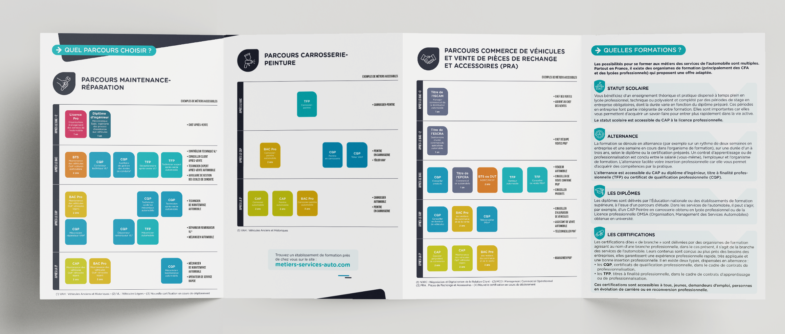 Création ligne graphique et réalisation des livrets des métiers de services auto, camion, moto et vélo.